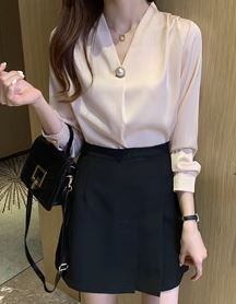 華やかで清楚な女性を演出する、なめらか素材のボタントップスです。