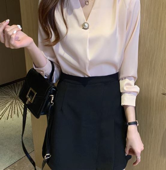Vネックで首元がスッキリと見え、パール調のボタンでさらに魅力的に。