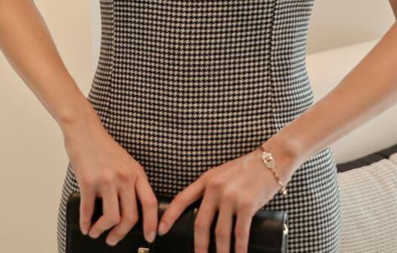 凛とした印象が魅力的な、千鳥格子のノースリーブワンピースです。