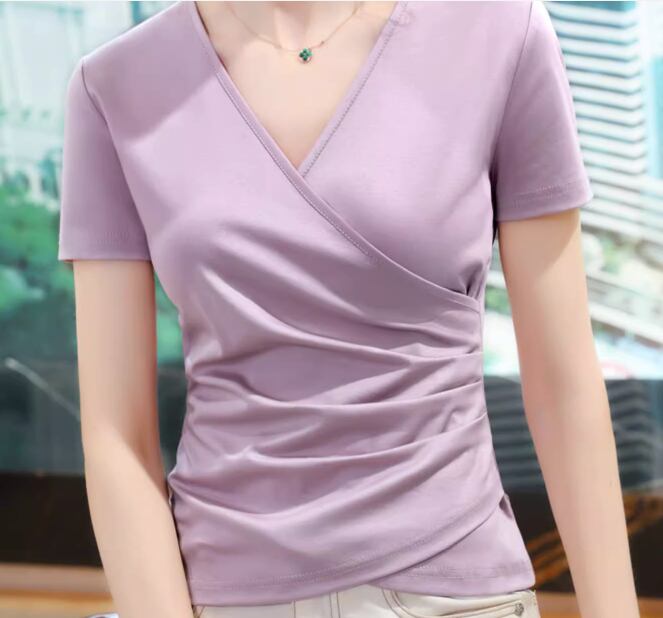 女性らしいシルエットと清涼感が魅力のダン語シルケットコットン Tシャツ。クロスVネックとウエストトップのデザインが、大胆さとセクシーさを演出します。今年の夏は、涼しくて快適な着心地で過ごしましょう。