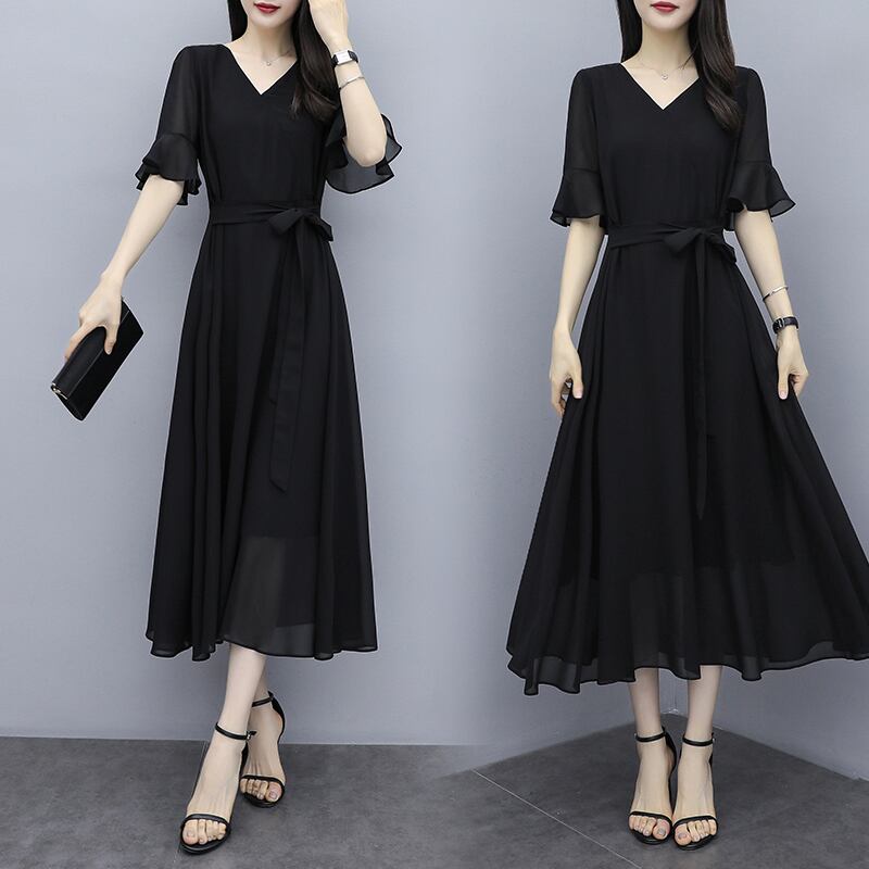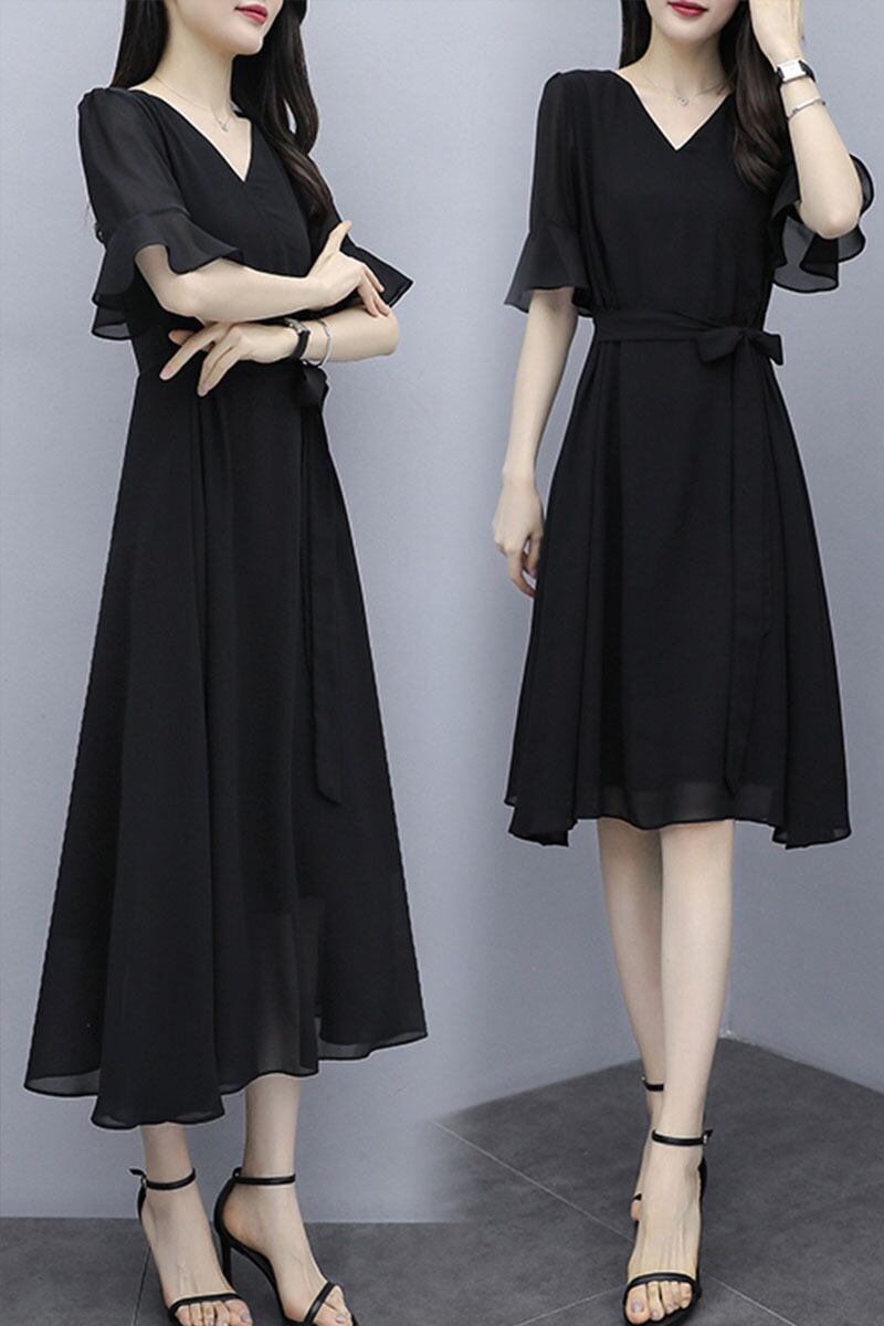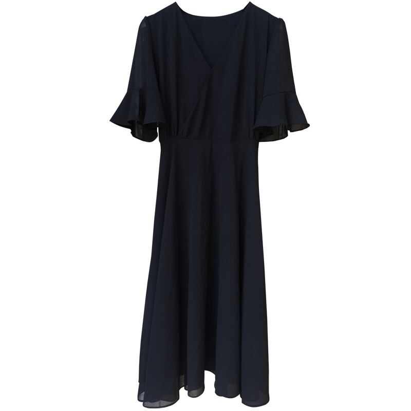 華やかな夏のイベントにぴったりな黒シフォンドレスが登場しました!女性らしいシルエットと上品なデザインが特徴です。Vネックと半袖の組み合わせで、デコルテラインや腕を綺麗に見せてくれます。ヘップバーンスタイルの美しいラインが、女性の気品を引き立てます。自分自身に自信を持っている女性にふさわしい一着です。