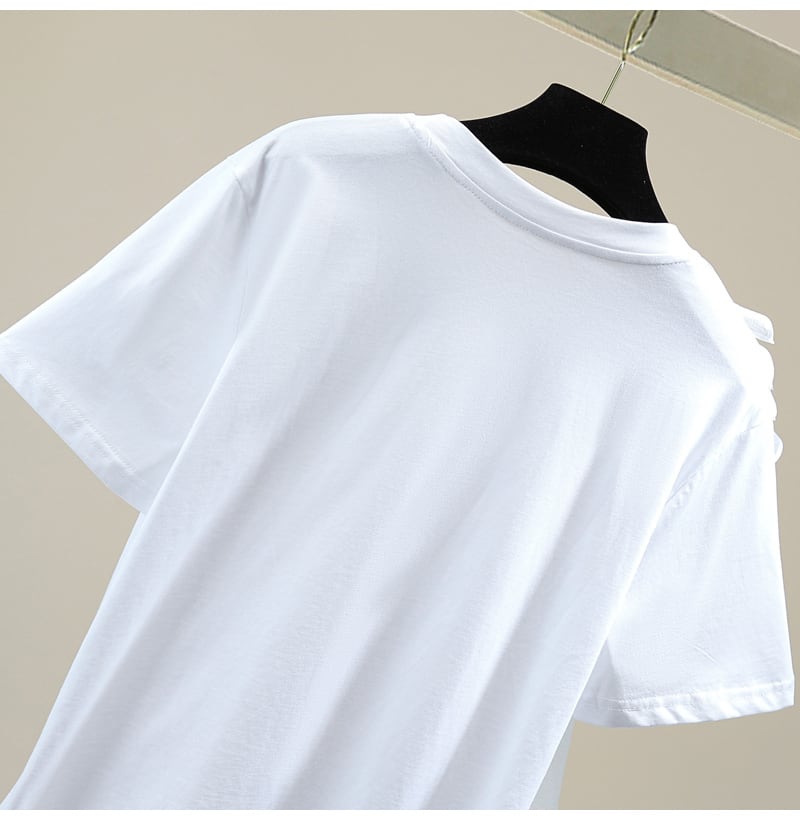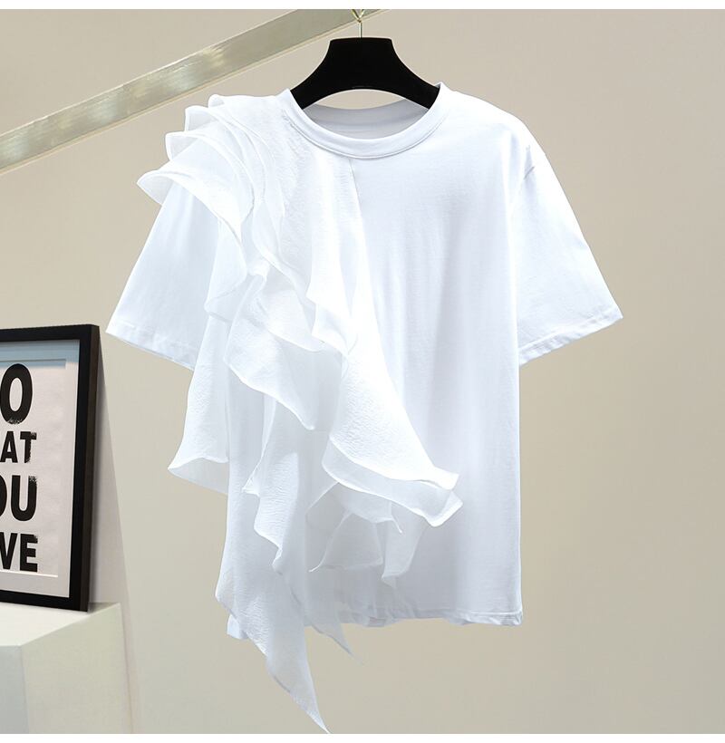 大人可愛い蓮の葉ステッチのフリルデザインTシャツ。シンプルでありながら、デートやお出かけ、パーティーなど様々なシーンで活躍してくれる一枚です。フリルのデザインが女性らしさを引き立て、蓮の葉ステッチが個性的な存在感を醸し出しています。