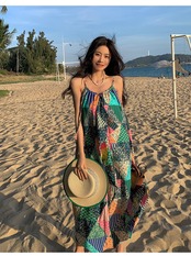 リゾート感溢れるデザインのフレアワンピースが登場しました!胸元と背中をすっきり見せるデザインで、女性らしいシルエットを演出します。総柄のパッチワークがエスニックでエキゾチックな雰囲気を醸し出し、リラックス感とこなれ感をアピール。さらに、Aラインのシルエットで体系をカバーし、脚長効果もあるため、幅広い年代の方におすすめです。