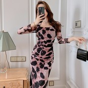 甘くエレガントな雰囲気が漂うヒョウ柄ワンピース。セクシーなシルエットとスクエアネックのデザインが女性らしい魅力を引き立てます。ヒップスリムできれいなシルエットを作り出し、大人可愛い雰囲気を演出します。