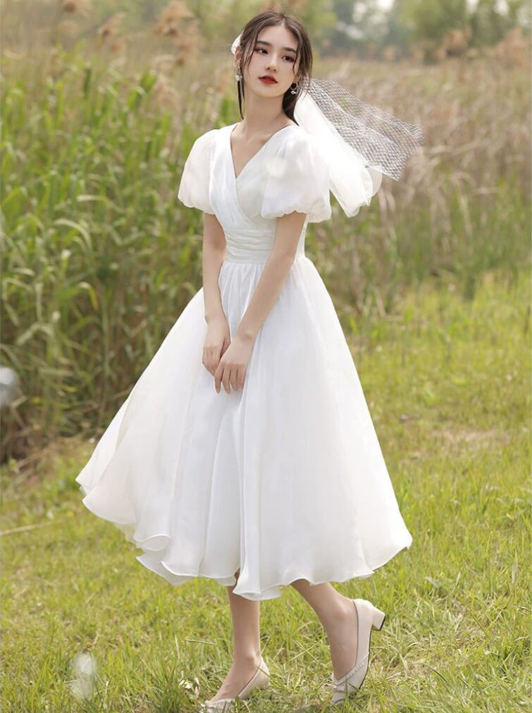 オシャレな女性にぴったりのフレアワンピドレスが登場しました!Vネックとボリューム袖が女性らしさを引き立て、ミモレ丈が上品な印象を与えます。襟なしデザインでスッキリとした印象になり、シフォン素材が優雅な風を演出。Aラインのシルエットがスリムで美脚効果も抜群です。さらに、無地のデザインなので様々なシーンで活躍できます。