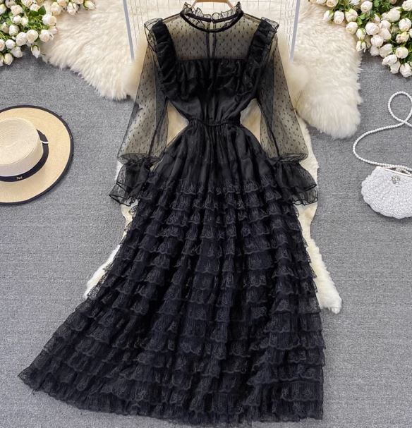 ゴージャスなレースとフリルがたくさんの、ロング丈ドレスワンピースです。