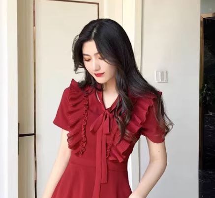 フリル使いがなんとも華やかな、真紅のワンピースです。