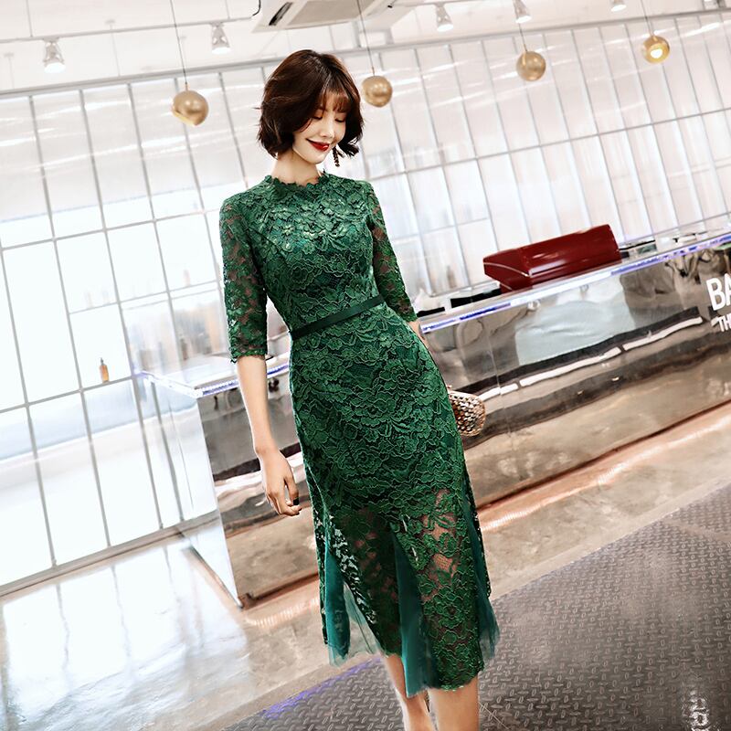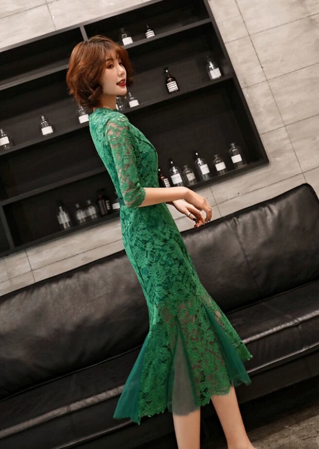 甘さとセクシーさを併せ持つイブニングドレス。5分袖、ハイネックデザインで上品さを演出しながら、ミモレ丈とフレアシルエットで女性らしい華やかさをプラス。透け感のあるレース素材が、大人可愛さと上品さを高めます。夜のデートやパーティー、結婚式など様々なシーンで活躍する一着です。