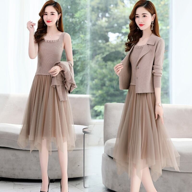 甘く可愛らしいスタイルを演出するセットアップジャケットとフレアワンピースのセット。Aラインの流れるようなシルエットとチュールのフリルが女性らしい印象を与えます。
