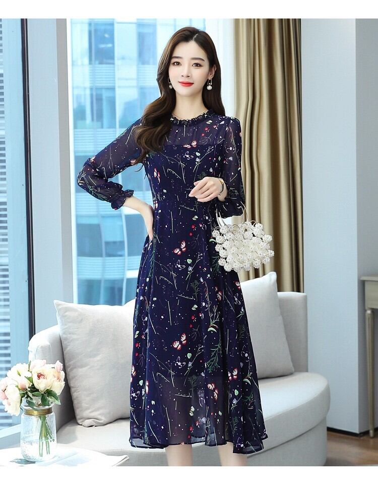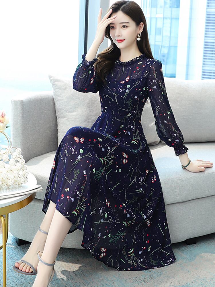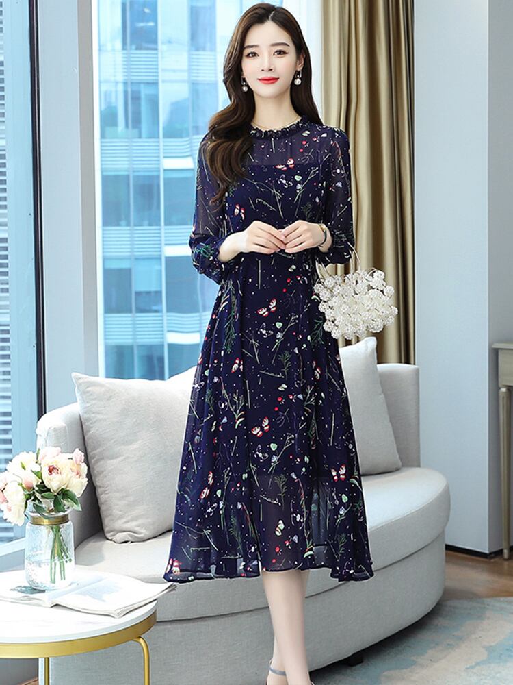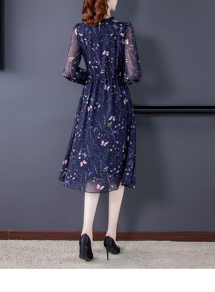デートやお出かけにぴったりの、膝下丈の7分袖ワンピースです。上品なラウンドネックとフレアのAラインシルエットが、女性らしさを引き立てます。さらに、透け感のある上品なシフォン素材が、大人可愛さを演出。花柄が特徴的で、大人女子のラブリーさを引き立てます。