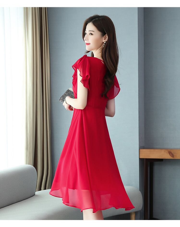 大人可愛いワンピースドレス。フレアスリーブが女性らしさを引き立てるデザインです。Vネックと不規則丈の組み合わせが、おしゃれで上品な印象を与えます。シフォン素材の透け感ととろみ感が、エレガントな雰囲気を醸し出しています。シースルー感もありますので、結婚式や二次会、パーティーなどの華やかな場でも活躍できます。