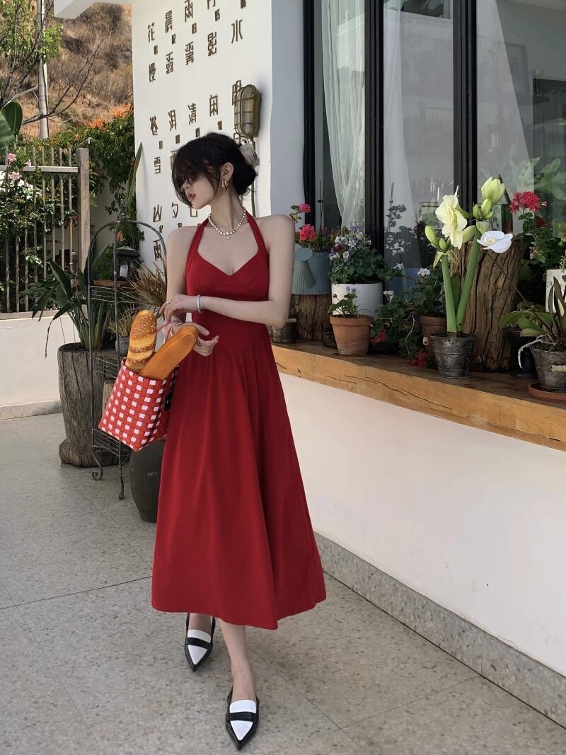 シンプルなデザインが魅力のフレアワンピース。大人可愛いスタイルを演出し、あらゆるシーンに対応します。Aラインのシルエットがスリムな印象を与え、脚長効果も抜群です。ノースリーブで軽やかな着心地で、夏の暑い日でも快適に過ごせます。ホルターネックデザインが女性らしさを引き立て、肩甲骨を美しく魅せます。