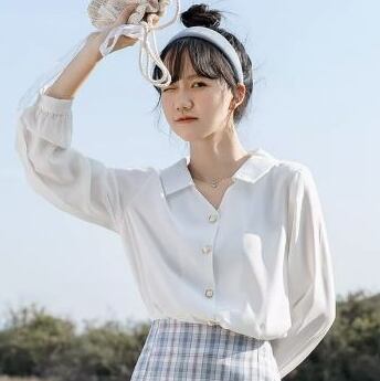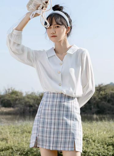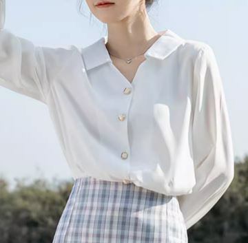 さりげなくあいたVネックの胸元でフェミニンさを演出。上品なボタンがアクセントに。