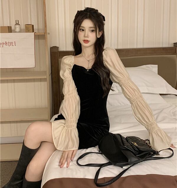 エレガントなデザインのミニ丈ワンピースです。スクエアネックが上品でありながら、シフォン素材が抜け感とこなれた雰囲気を演出します。伸縮性のある素材なので着心地も良く、ベロアの風合いで高級感も演出します。