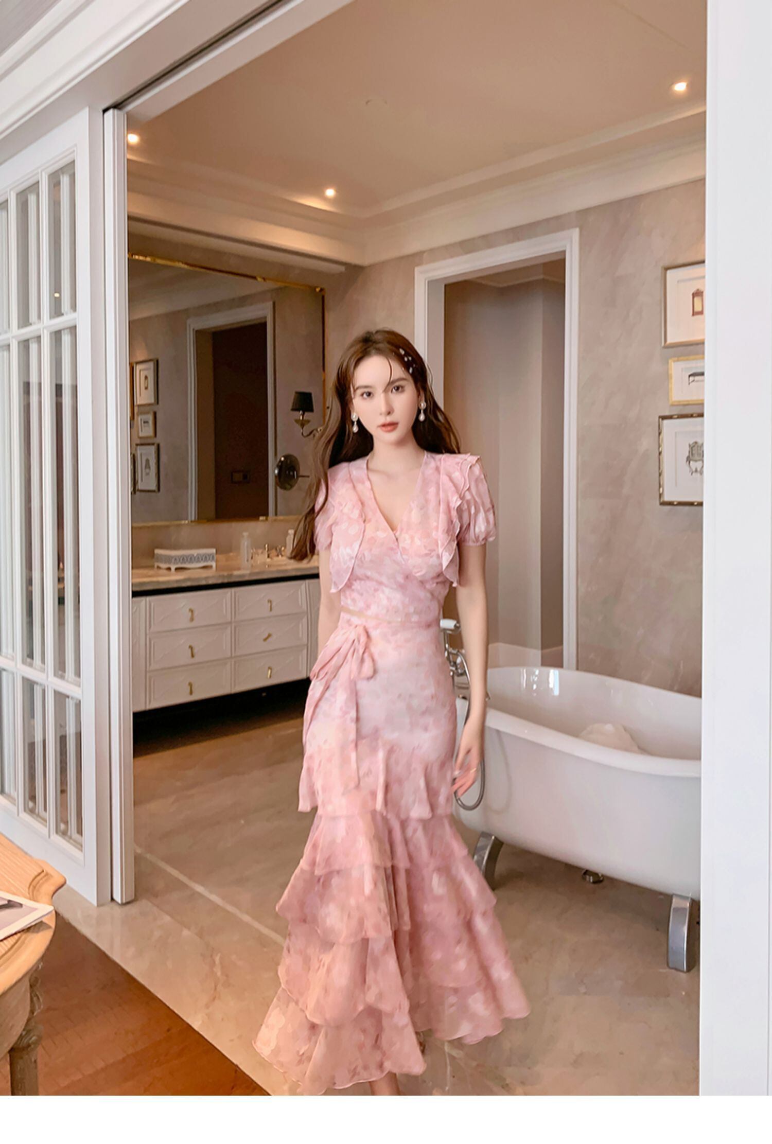 大人可愛い雰囲気漂うツーピースセットアップのワンピドレス。上品なVネックとウエストマークが女性らしいスタイルを演出します。ロング丈のフレアスカートが脚を美しく見せ、Aラインシルエットで体型カバーも叶います。フリルディテールが可愛らしいアクセントになり、個性的な柄使いがトレンド感を演出します。