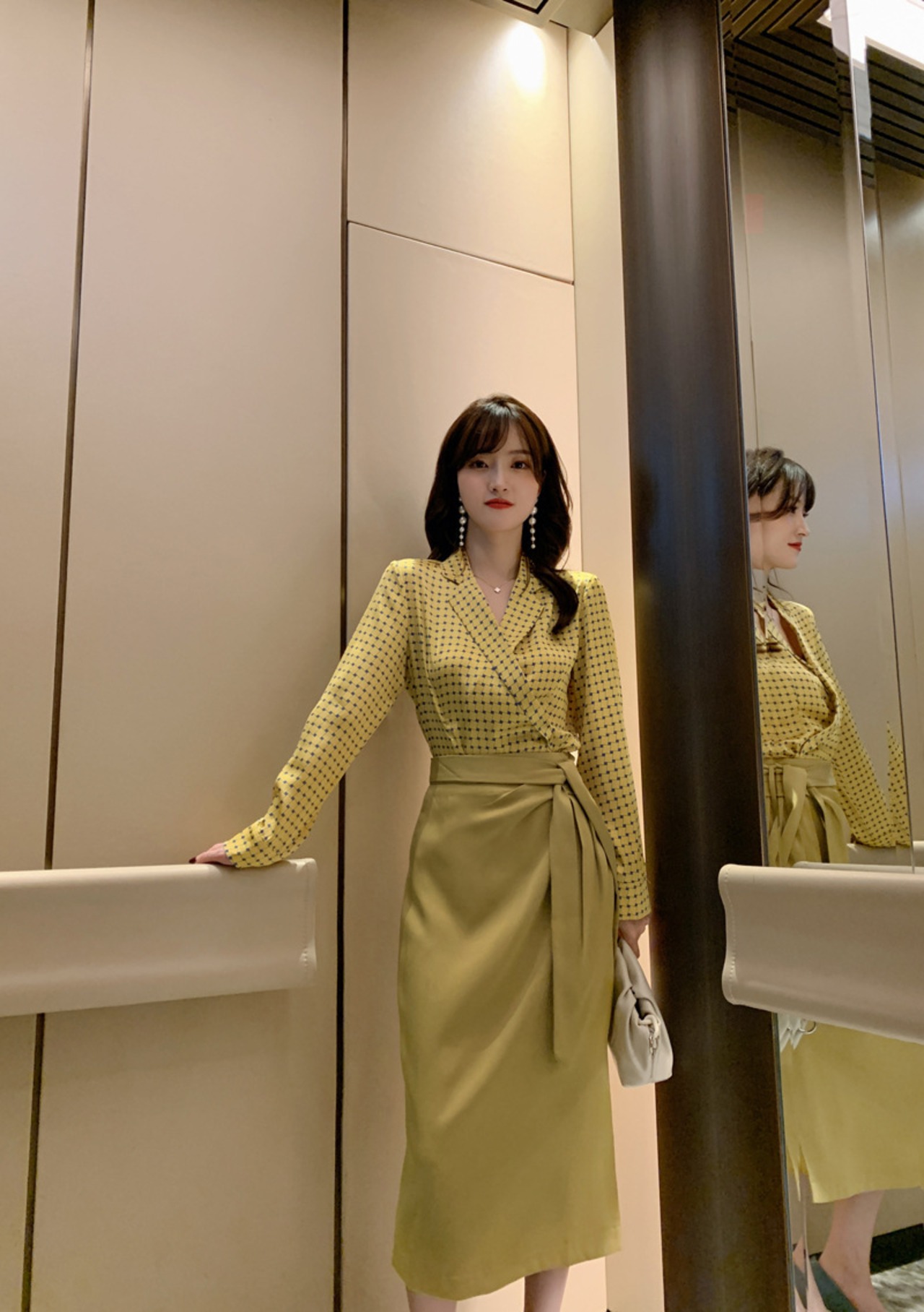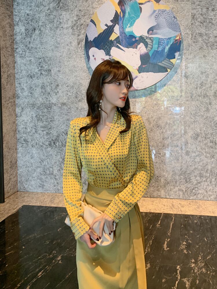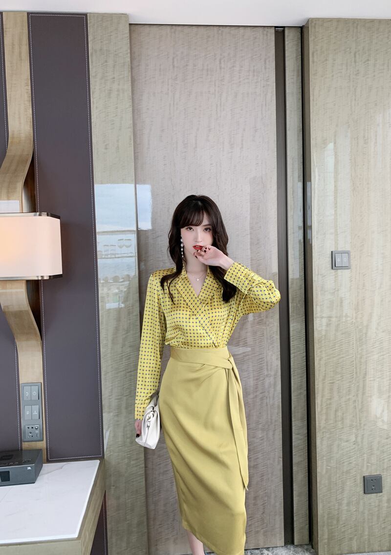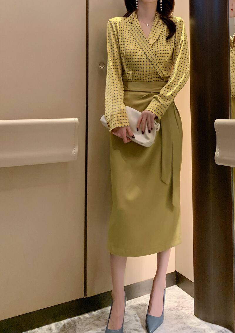 大人可愛いデザインで、女性らしい上品な印象を与えます。Vネックの襟付きブラウスは、スリムなフィット感で細身のシルエットを演出します。ウエストマークでスタイルアップ効果もバツグン。さらに、サイドスリットが入っているので、腰回りや脚部分も華奢に見えます。