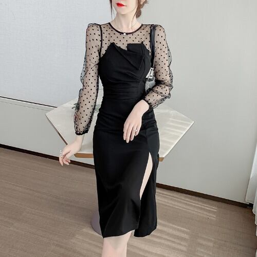スリムなシルエットとウエストマークが女性らしいスタイルを演出し、長袖と透け感のあるデザインで上品さもプラス。さらに、サイドスリットが入っているので動きやすく、夏でも涼しく着用できます。水玉柄はトレンド感があり、レディースのデートやお出かけにぴったり!