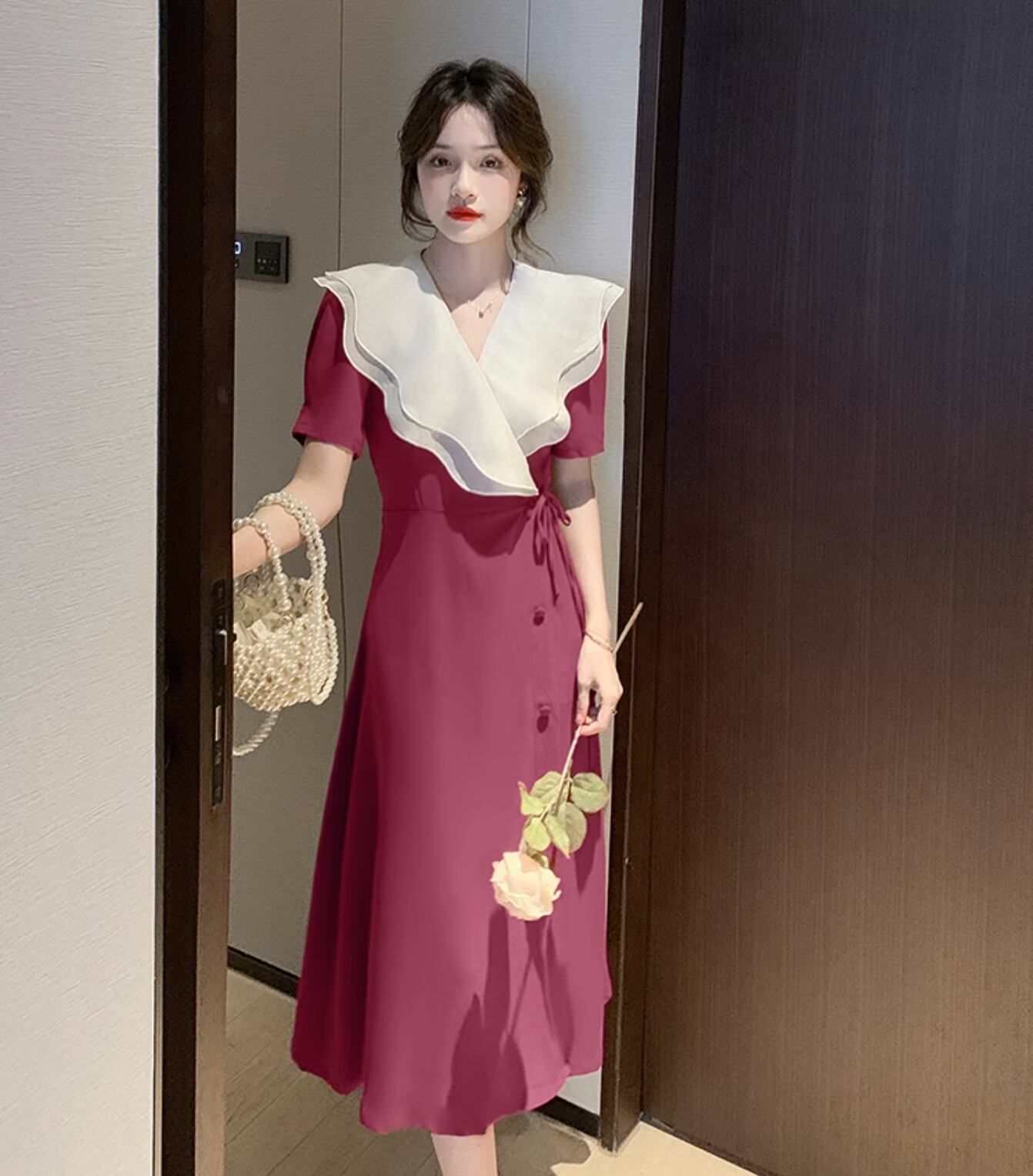 大きなフリルの襟が特徴的なフレアワンピースです。