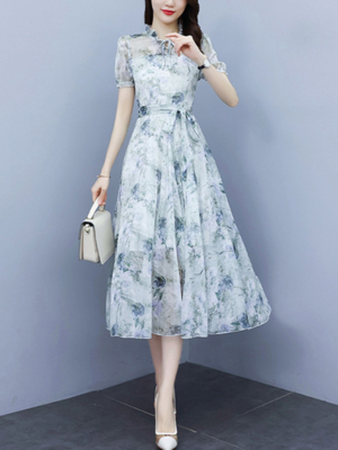 ミモレ丈で半袖のデザインなので、春夏のおしゃれに大活躍間違いなしです!フレアスリムのAラインシルエットが女性らしさを引き立て、ウエストリボンでアクセントを付けました。透け感のあるシフォン素材とフリルのディテールが、キュートで大人可愛い雰囲気を演出します。
