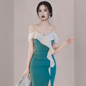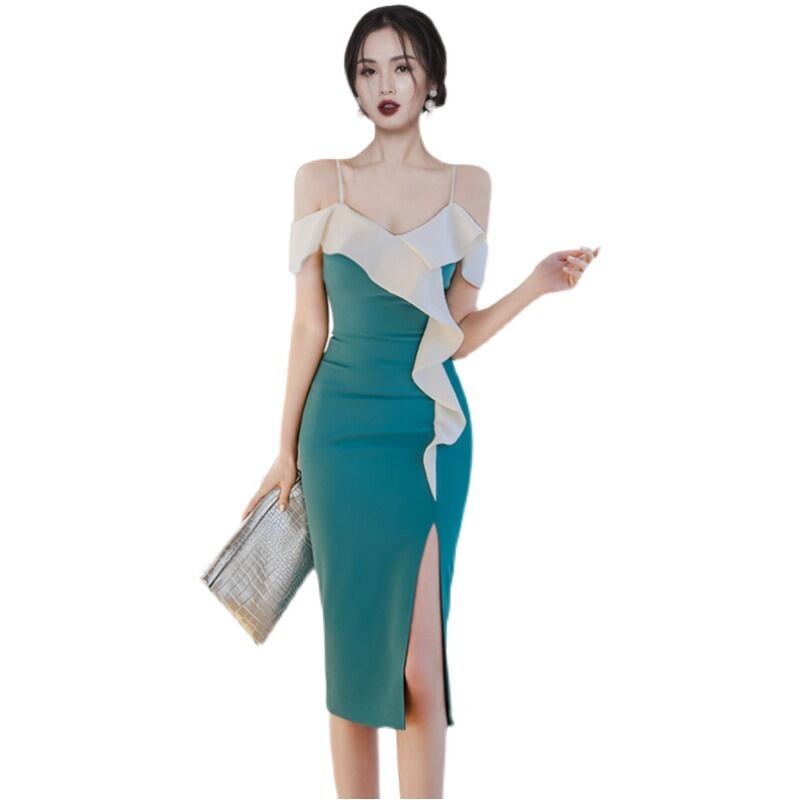 甘く可愛らしいスタイルを演出するドレスワンピース。膝丈のIラインデザインで、スレンダーラインを強調し、女性らしいシルエットを作り出します。ドロップショルダーと胸元の谷間魅せデザインが、セクシーさと上品さを同時に演出。