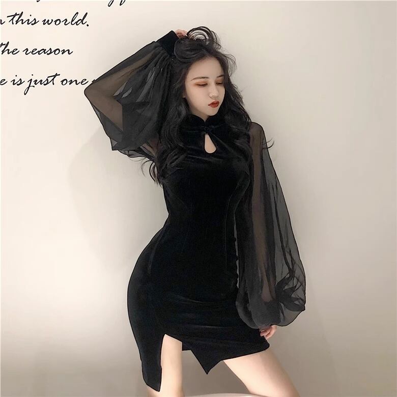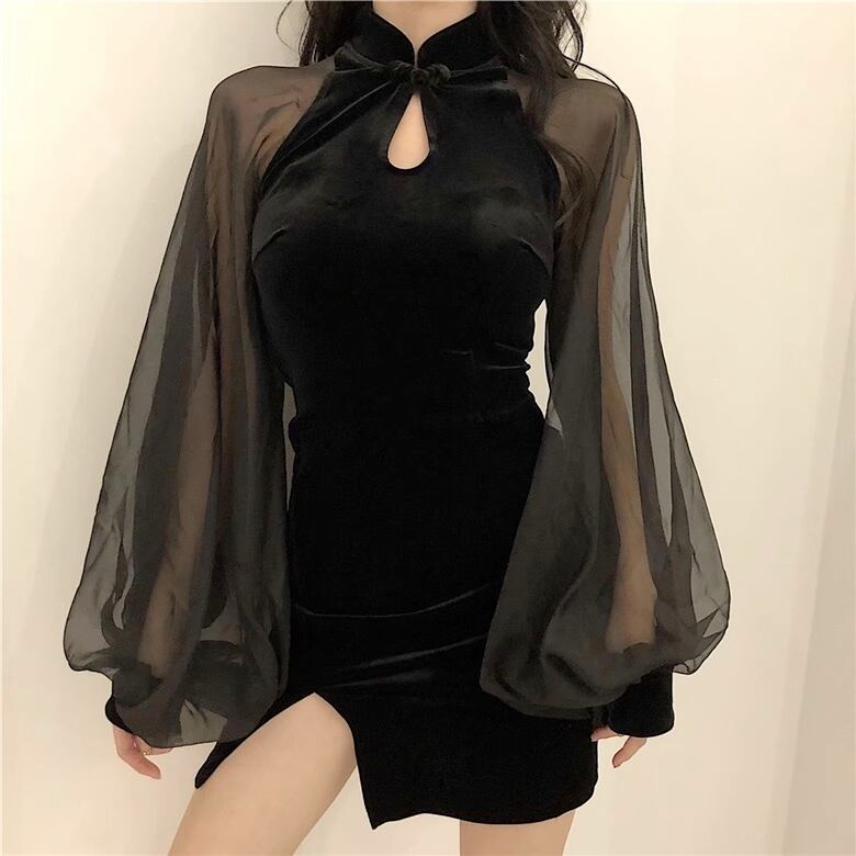チャイナ風なデザインにシースルーのボリューム袖が特徴的なミニ丈のワンピースです。