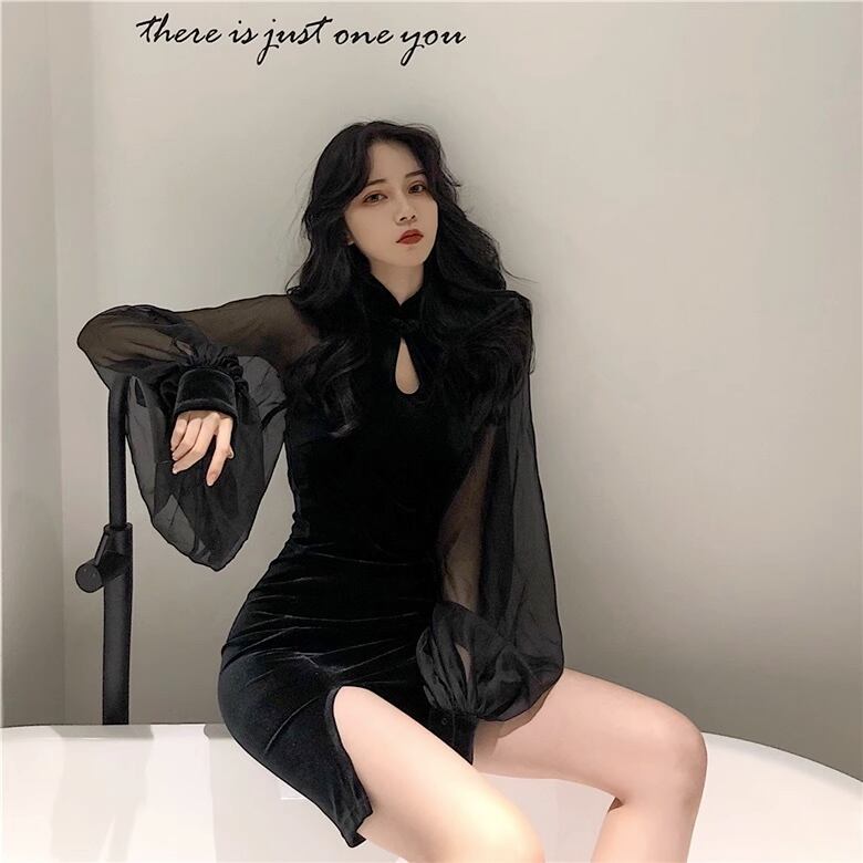 チャイナドレスを思わせるデザインが個性的で、そこに合わせられるシースルーがセクシーさを演出してくれます。