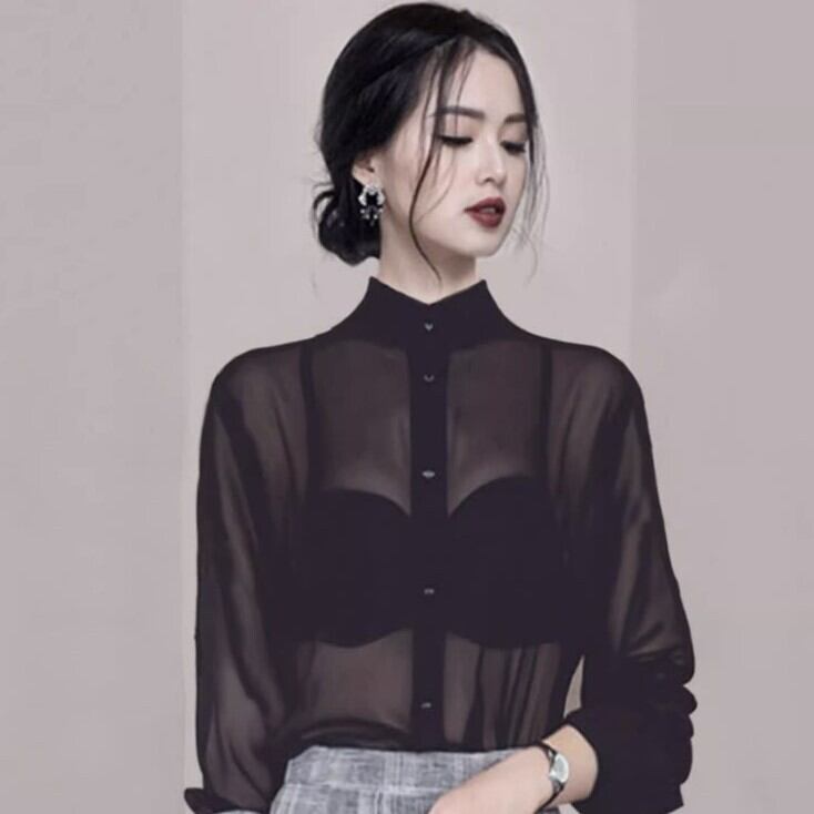 シースルーなシフォンシャツのボトリングシャツが新登場!デートやお出かけにぴったりな、高級感漂う一枚です。袖ありのデザインとボトルネックが女性らしさを引き立て、シフォン素材が上品な印象を与えます。