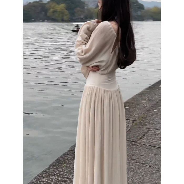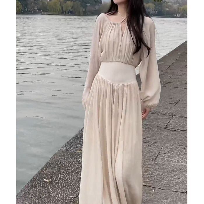 大人可愛い印象を与えるVネックとギャザーのデザインで、女性らしさを引き立てます。