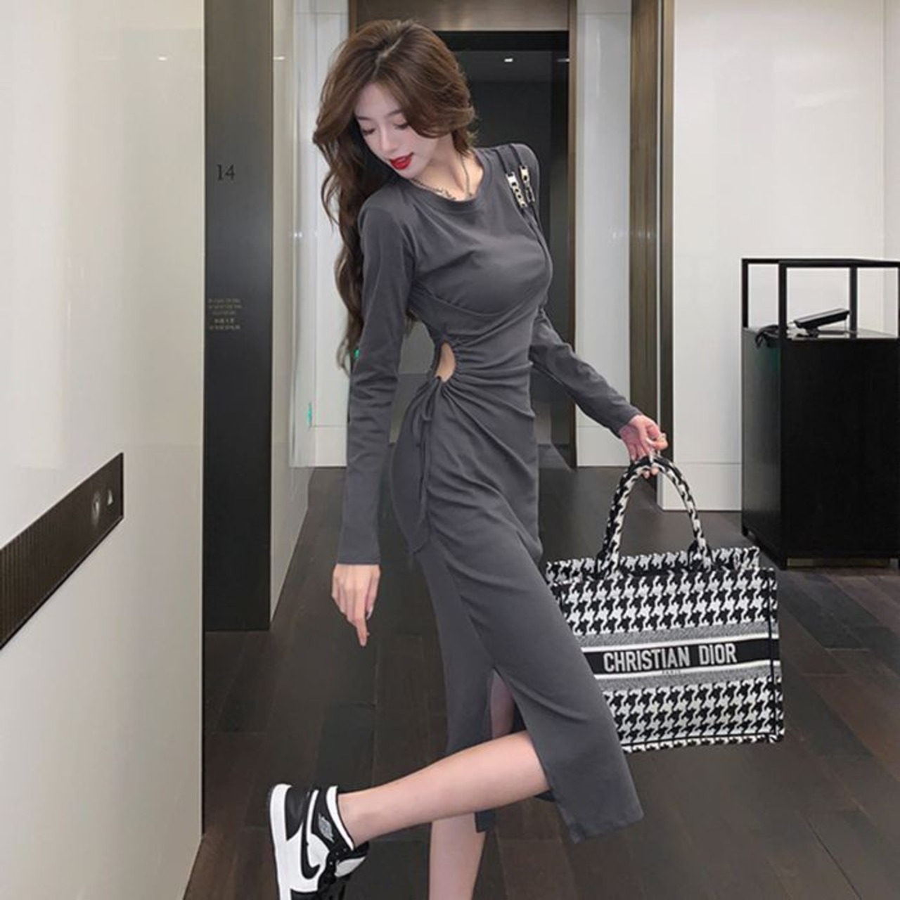 ミモレ丈で上品な印象を与えながらも、サイドスリットがセクシーさをプラスし、きれいめな場にもカジュアルな場にも対応できます。
